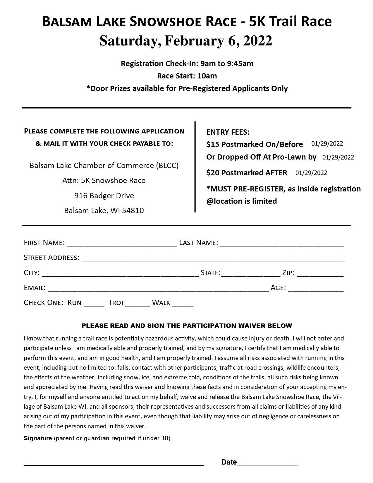Right click the image below to download the registration form. Once downloaded, print and complete the form. Visit balsamlakesnowshoerace.com for more info! You can also pick up a form at Balsam Lake Pro-Lawn!